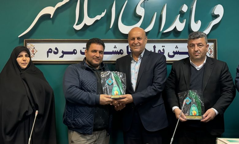 نوراله طاهری، سرپرست فرمانداری اسلامشهر، در جلسه بررسی مشاغل خانگی از زحمات حسن محمدی مهینی، رئیس کمیته امداد امام خمینی (ره) و حمیدرضا جعفریان، رئیس اداره بهزیستی اسلامشهر، به پاس تلاش‌هایشان در رفع مشکلات اقشار ضعیف شهرستان تقدیر کرد.