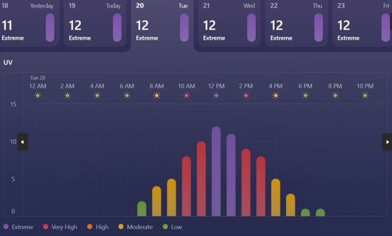 «پایش سطح تابش فرابنفش از ساعت ۱۱ تا ۱۴ امروز به مرحلهٔ بسیار بالا می‌رسد.» این گزارش پایگاه هواشناسی MSN از هوای این روزهای تهران است.