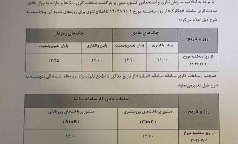بیشتر بخوانید »به گزارش شهراوند، بانک مرکزی با صدور بخشنامهای از اول مهرماه ۱۴۰۴ تا اطلاع ثانوی ساعات کاری دو سامانه مهم…